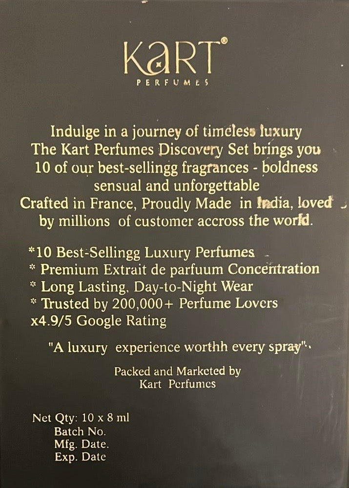 Each fragrance embodies a unique persona — bold, elegant, and irresistibly distinctive. Designed to deliver long-lasting performance with exceptional projection, this discovery set is the perfect gateway to explore the finest from Kart perfumes.